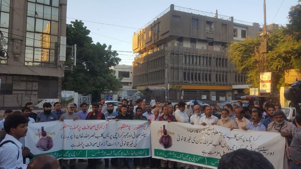 Caption: Journalists protest raid on Karachi Press Club and arrest of colleague Nasrullah Khan by security personnel.